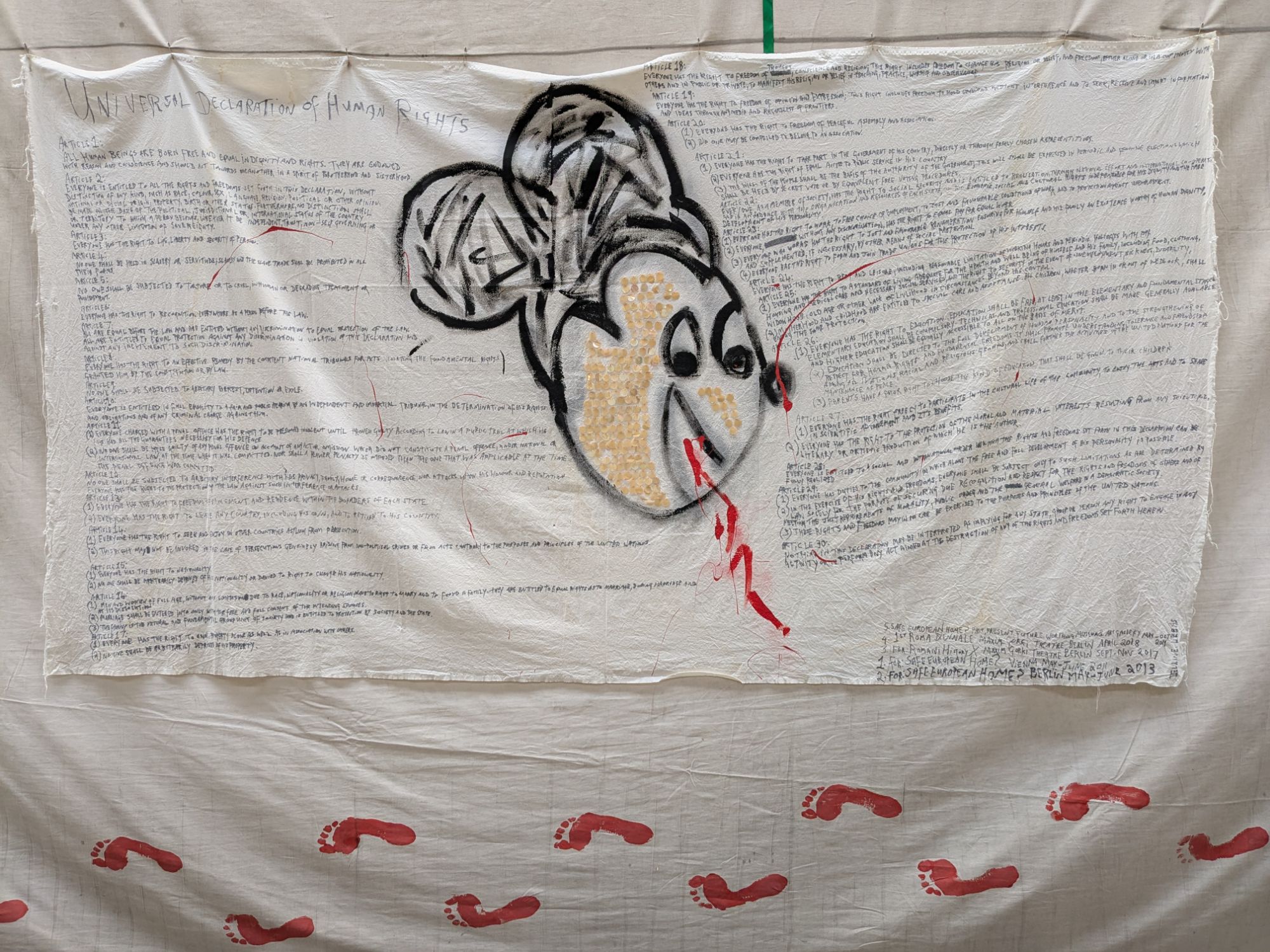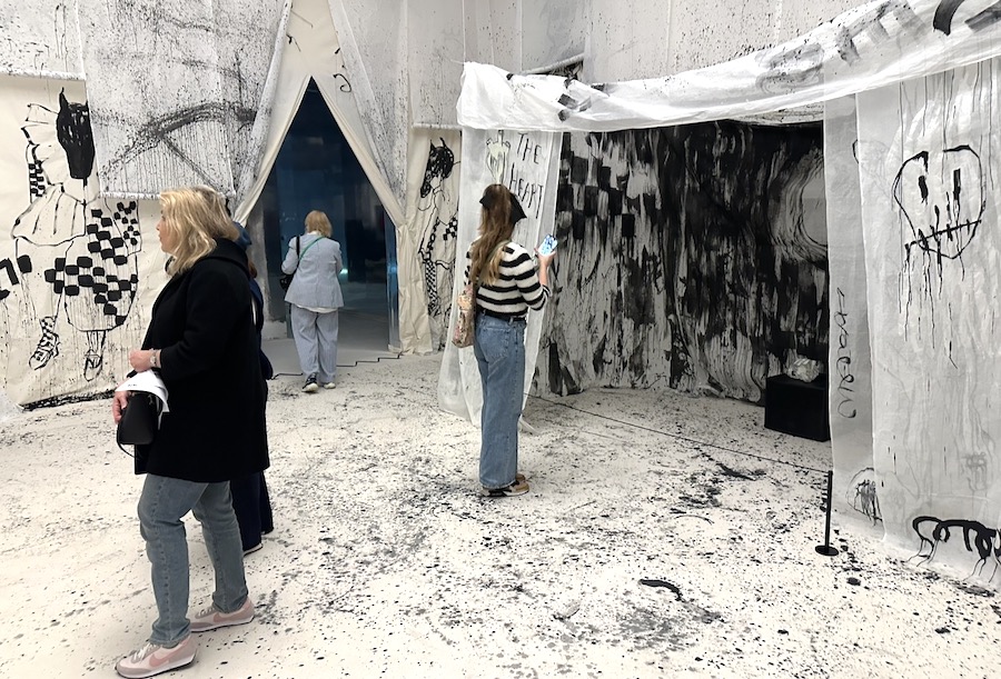 In Le Bas’s installation, the chequer pattern is on the clothing of, what appears to be a human like figure with the face of a dog (our photo pending, but see the left hand side of this photo on Artlyst). A similar theme to Johnstone’s masks.